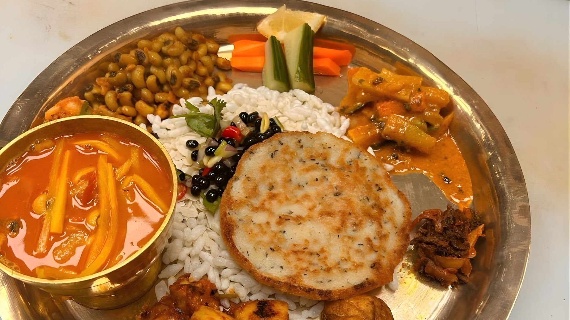 A traditional Nepali meal with rice, dal, vegetable curry, papad, achar, gundruk (fermented greens), saag (mustard greens) dahi (curd) and ghee.