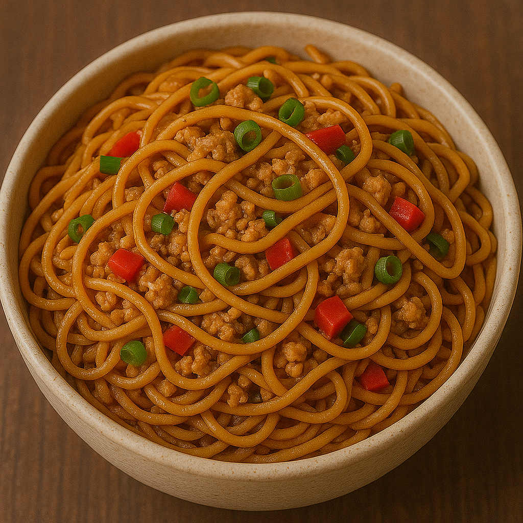 Thick noodles with spiced minced with Pork, bok choy, soy sauce and chilly oil.